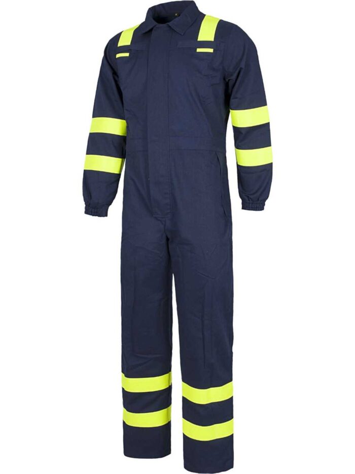 - Una cinta fluorescente amarilla ignífuga en hombros y dos en mangas y y perneras. Puño con elástico. Canesú y elástico en la espalda. Tejido: 87% Algodón 12% Nailon 1% Fibra Antiestática (260 g/m2).